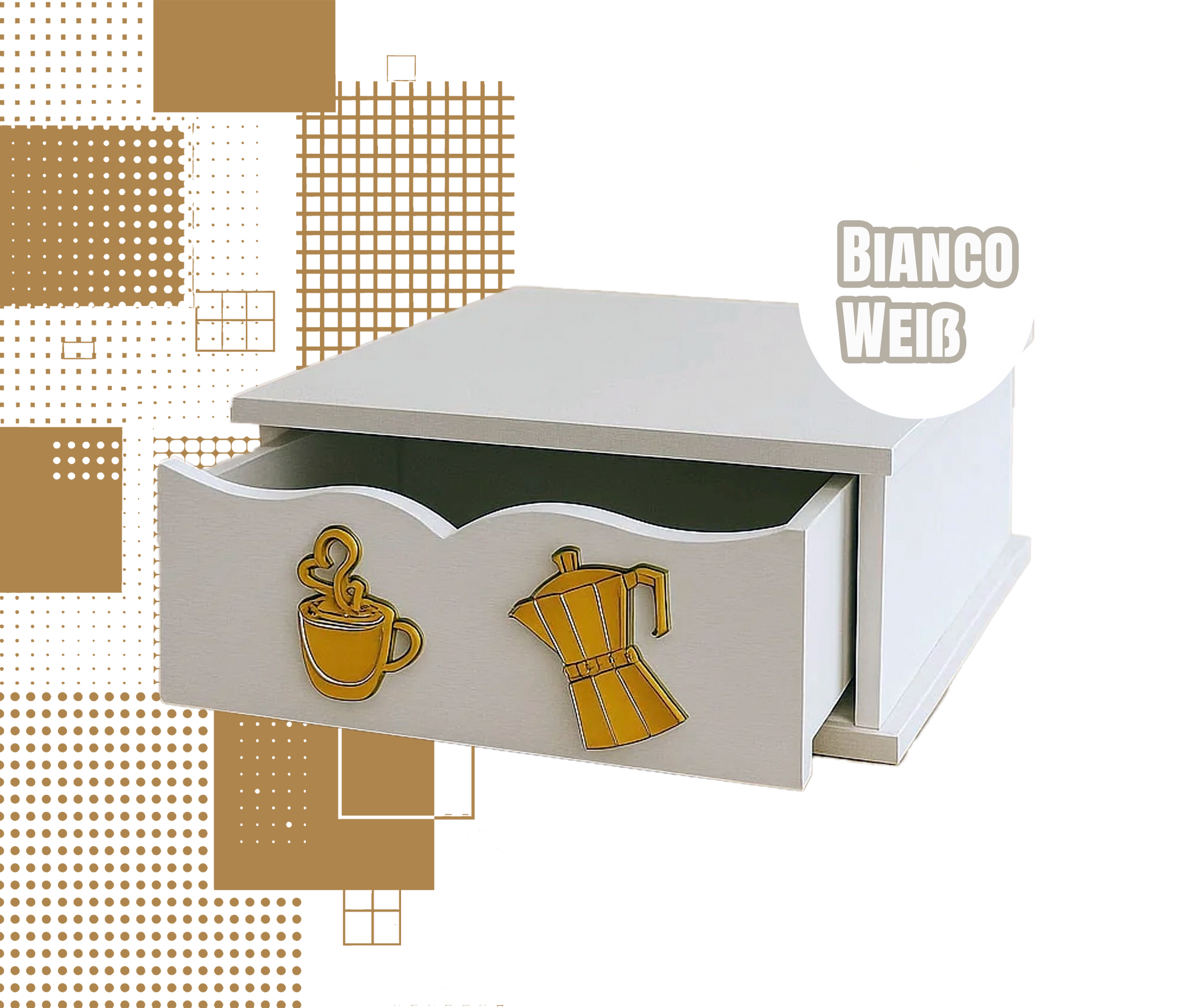 Diese Kapselschublade ist nicht nur ein praktisches Zubehör, sondern auch ein stilvolles Dekorationselement, das Ihre Coffee Station aufwertet. Ideal für alle, die Wert auf Liebe zum Detail legen und ihren Kaffeebereich ordentlich, funktional und ästhetisch gestalten möchten.